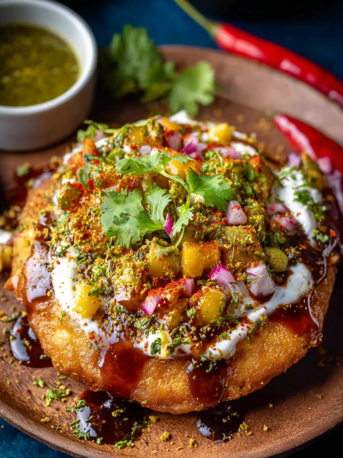 A delicious Indian snack made with spiced boiled potatoes, served with chutneys and yogurt.