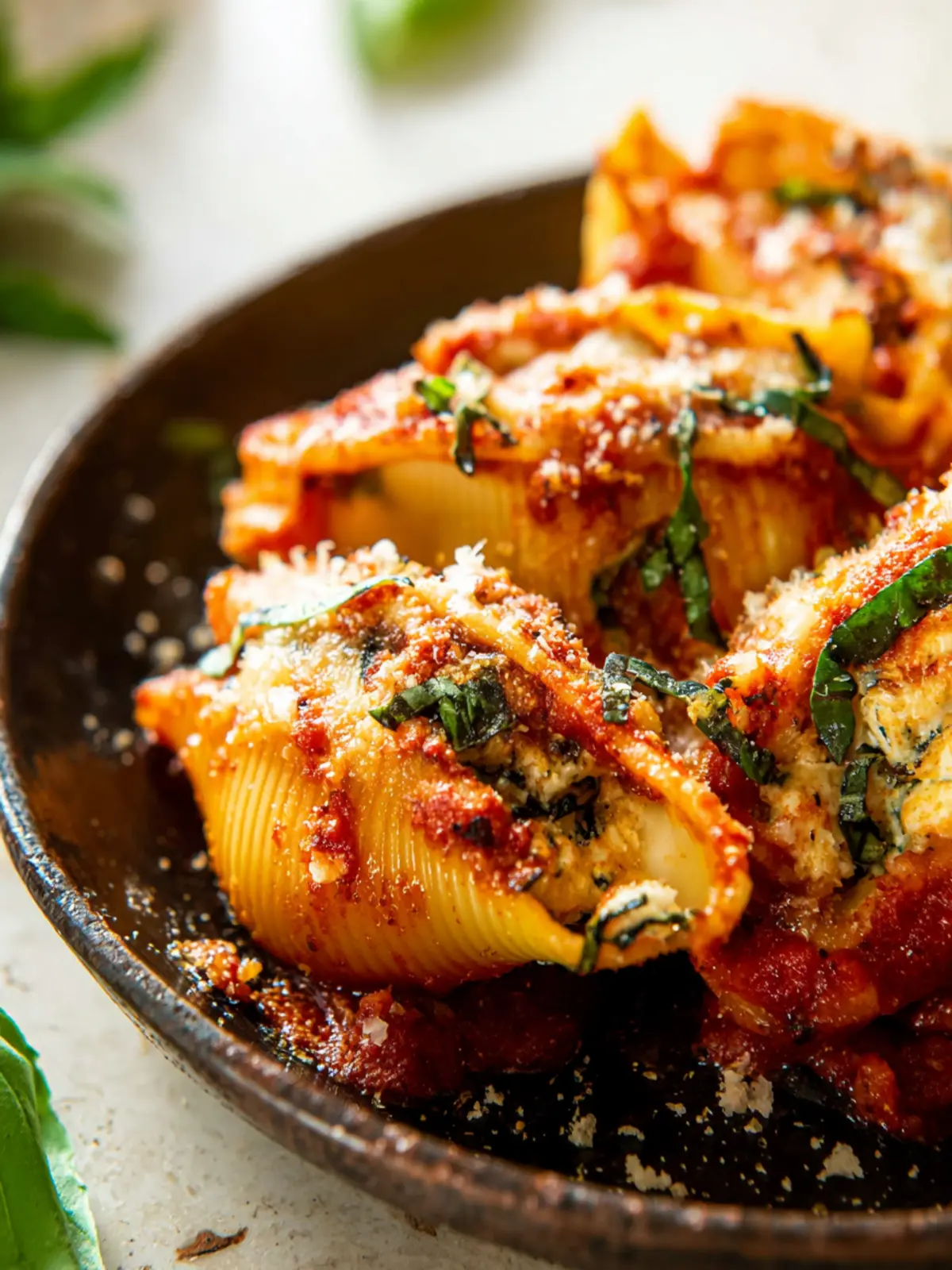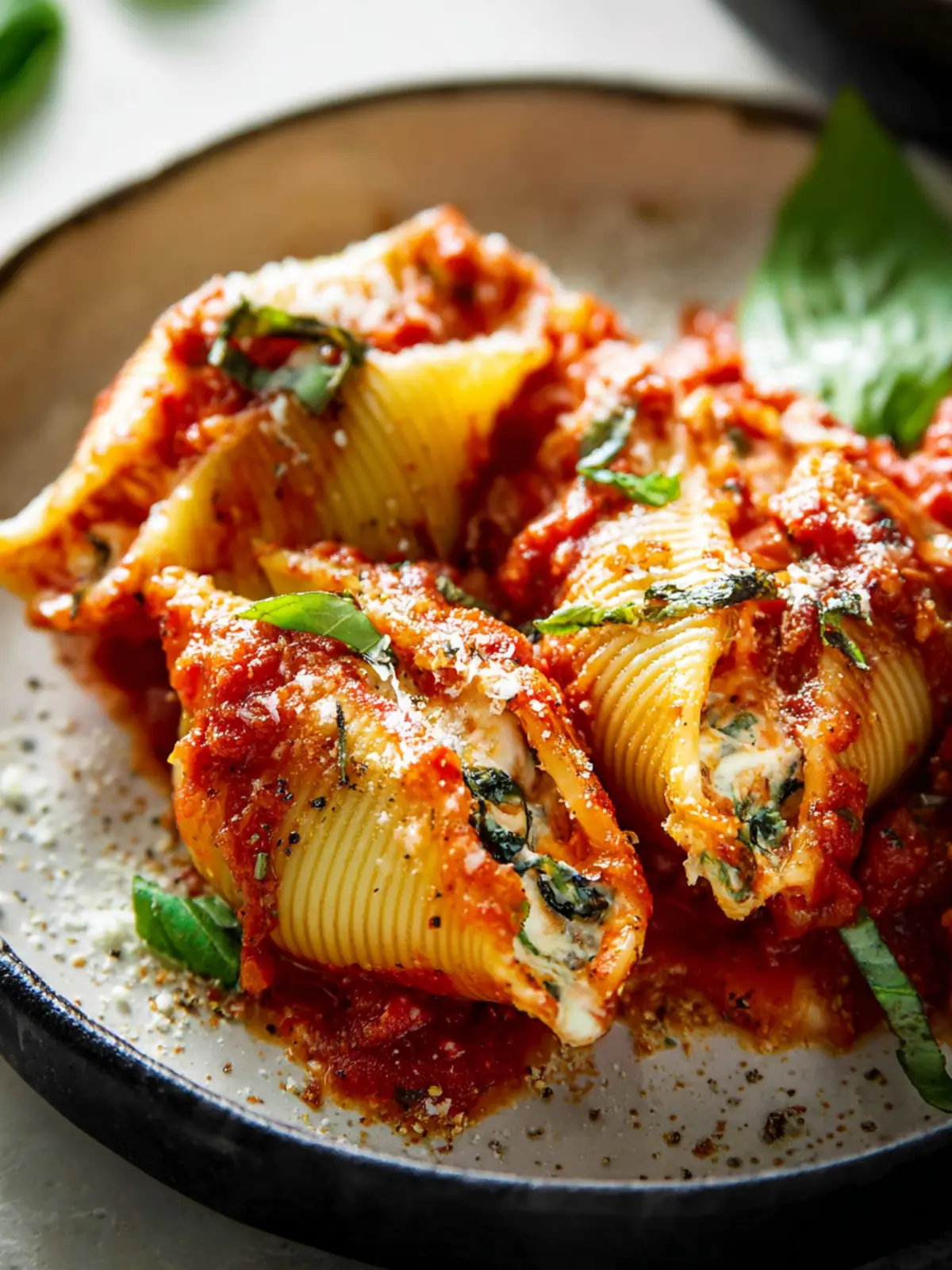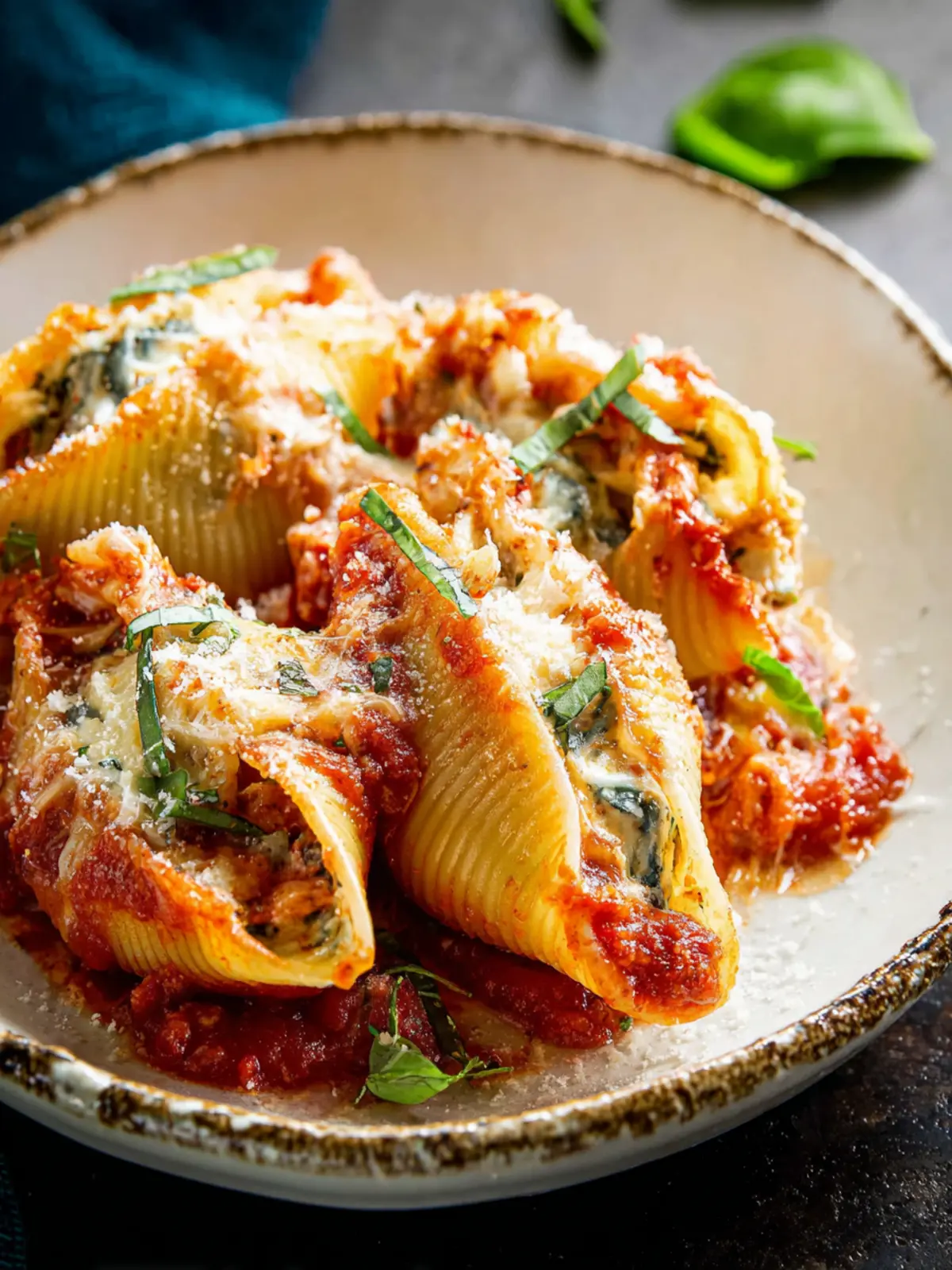 Delicious stuffed jumbo pasta shells filled with creamy ricotta and spinach, topped with marinara sauce and cheese.