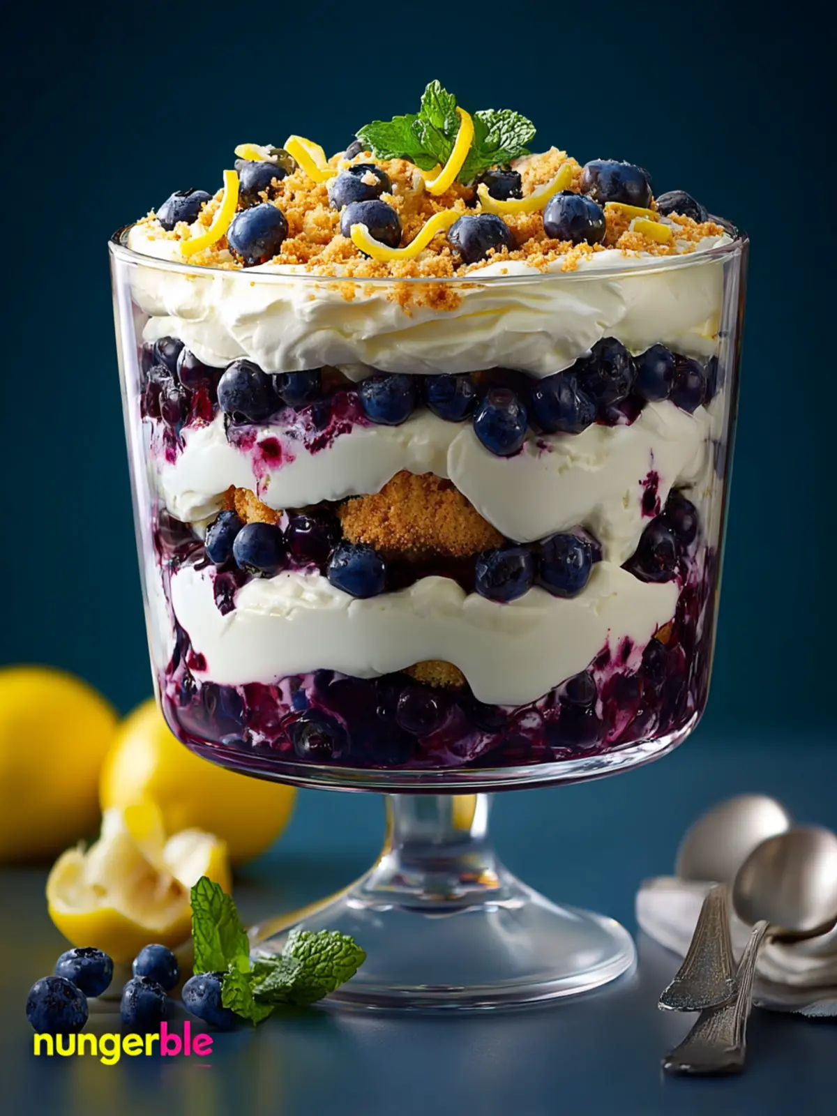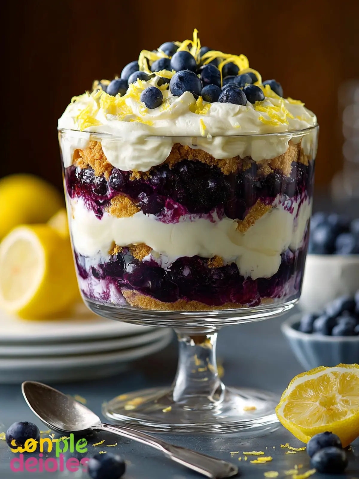 A delightful lemon blueberry trifle made with fresh blueberries, cream cheese, and whipped cream.