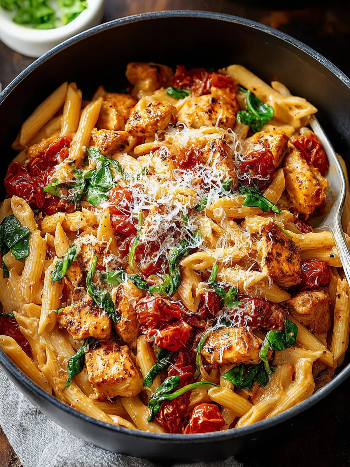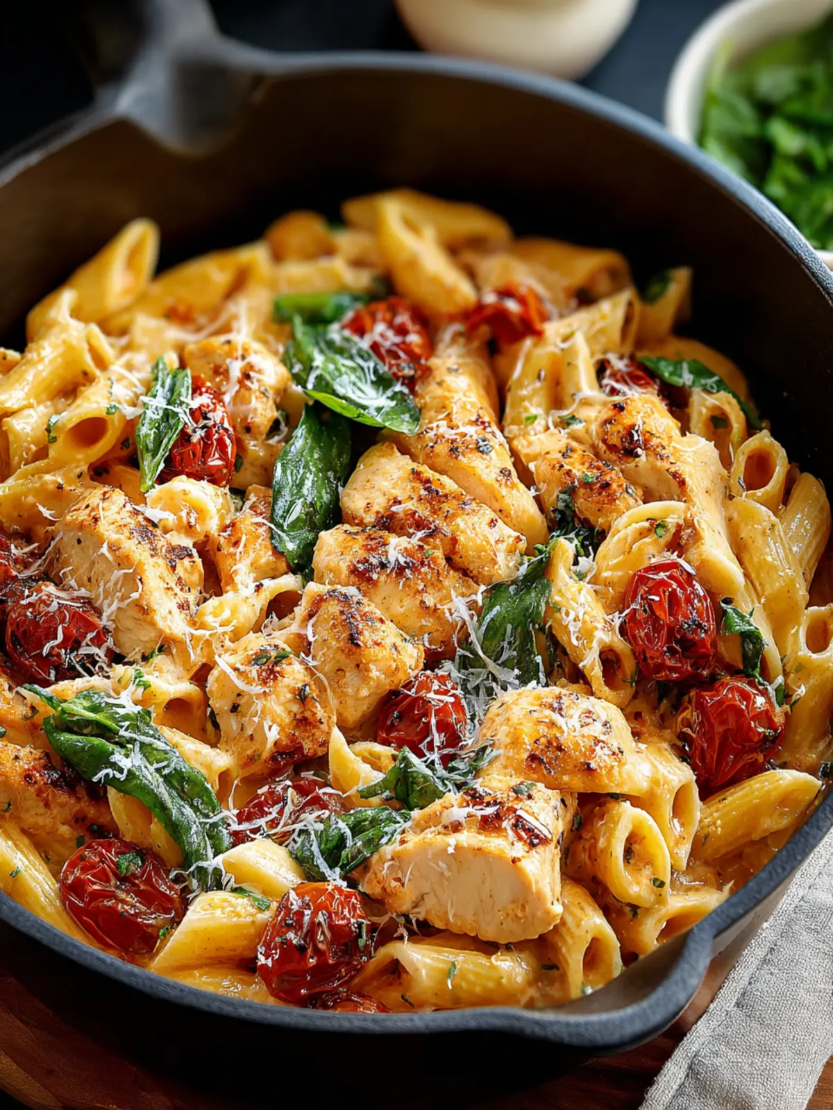 A delicious creamy pasta dish with chicken, spinach, and Parmesan cheese.