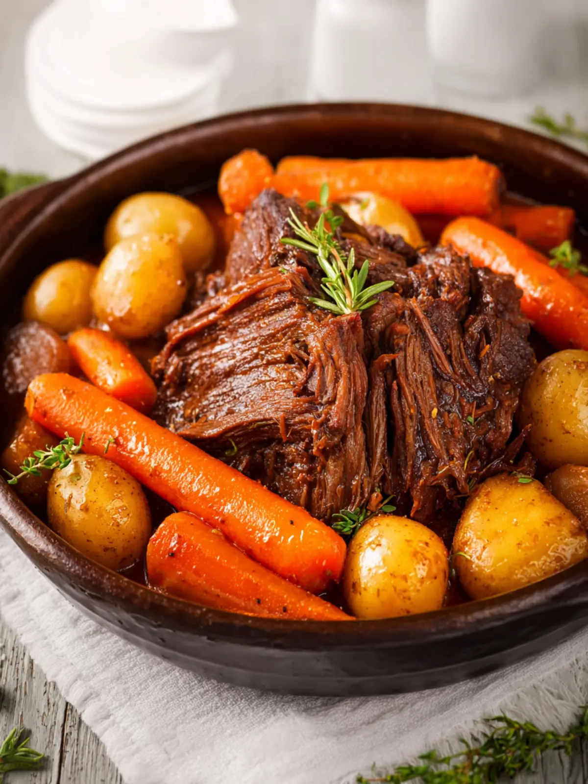 A hearty slow cooker recipe featuring tender chuck roast, Yukon gold potatoes, and baby carrots, all simmered in a flavorful gravy.